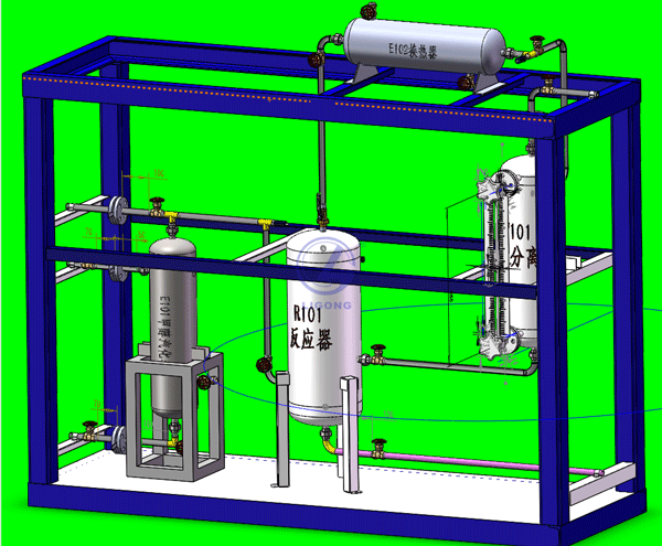 整套裝置由鋼制安裝框架、反應器、換熱器、冷凝器、汽化器、仿真儀表、就地計算機操作臺、、就地智能儀表控制上位監控軟件、外置配套設備等組成。,工藝路線簡潔清晰,現場儀表與通訊模塊有機結合,上位計算機控制,設置DCS界面及自動評分系統。
