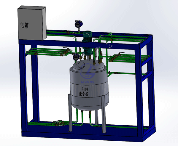 整套裝置由鋼制安裝框架、聚合釜、換熱器、凈化釜、仿真儀表、就地計算機操作臺、、就地智能儀表控制上位監控軟件、外置配套設備等組成,工藝路線簡潔清晰,現場儀表與通訊模塊有機結合,上位計算機控制,設置DCS界面及自動評分系統。
