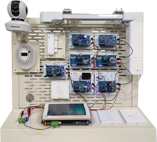 實訓臺涵蓋嵌入式接口技術、ZigBee自組網技術、WiFi無線通信技術、生物識別技術、網絡傳輸技術、應用軟件開發技術的知識點及智能家居行業應用知識。平臺采用Cortex-A9異構網關作為家庭控制終端,集成溫濕度、光照度、空氣質量、指紋識別等無線傳感器,燃氣、門磁等無線安防探測器,繼電器、窗簾電機、調光面板、強電插座等無線控制器,網絡攝像頭及電表等,實現家居環境監測、安防監控、智能入戶、家電控制、遠程抄表、視頻監控等功能。提供家居設備安裝調試、組網傳輸測試、云平臺家居場景搭建、智能家居APP應用軟件開發、智能家居Web應用軟件開發等完整的實訓案例。實訓臺外觀如圖所示。