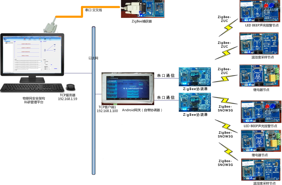 包含2組ZigBee自組網絡。ZigBee傳感器節點與協調器之間可配置為加密數據傳輸,加密類型支持ZUC、snow3G、Lblock、kasumi、AES五種輕量級加密算法。ZigBee協調器支持白名單入網保障機制,根據申請入網設備的MAC地址識別并判斷該節點是否合法,從而做出允許或拒絕入網的動作。Android網關采用TCP協議與PC服務器通信,實時接收ZigBee協調器解密后的傳感層數據,內嵌五種加密類型,支持靈活配置,將傳感層數據經過解析、重組,加密傳輸至PC端服務器信息平臺。服務器軟件平臺通過捕獲器捕獲傳感網幀,以流程條方式動態展示傳感層認證步驟,顯示繪制網絡拓撲結構,MAC/NWK/APS數據幀詳細數據,支持五種輕量級算法的加解密,分析數據幀的加密類型,統計加密算法的效率、列表顯示設備狀態、遠程監測與控制傳感器設備等。技術架構如圖所示:
