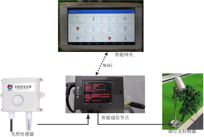 (1)路燈控制系統:由智能通信節點及外圍驅動電路板、路燈、光照傳感器組成。智能通信節點實時采集光照度,通過無線通信方式傳輸至網關。結合網關應用程序,可以實現路燈開關控制、環境光照度定時采集,設置光照傳感器與路燈控制器的聯動策略,根據光照強度,自動控制路燈開關;同時將光照度數據、路燈開關狀態上傳到云平臺進行可視化展示,遠程路燈控制。