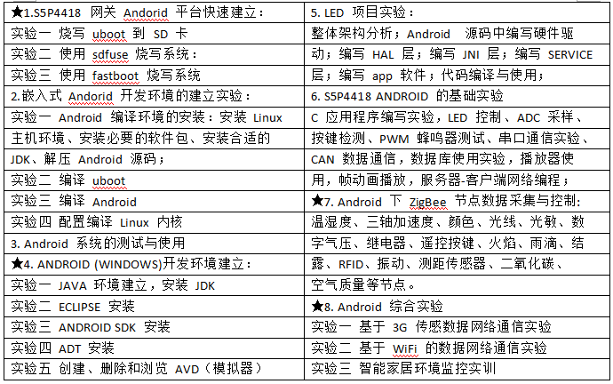 1、基于 Qt 的 WSN 網絡拓撲結構顯示實驗 2、基于 Android 的智能家居環境監控實驗 3、基于 Qt 的智能交通與停車管理實驗 4、基于 Android 的農業大棚遠程監控實驗 |