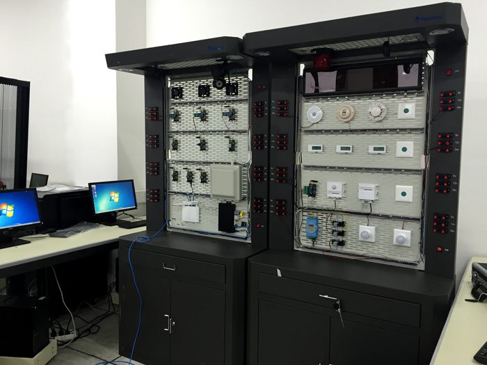 LGWL-ZS02型 物聯網智慧生活實訓平臺人體工程學設計,便于學生對于設備的安裝配置等實訓操作;配備兩組網孔操作面板(正面、頂部),用于部署各類物聯網設備;有強弱電供電系統,工位背面有10余個強電供電插座,工位正面配有8套直流弱電(常用的5V、12V、24V)供電接口,滿足工位上各類物聯網設備的供電需要,同時,面板上安裝了走線槽,方便學生進行各種布線;設計有安全配電箱,帶有空氣開關及漏電保護系統,一路電源輸入、一路開關總控,確保系統使用安全可靠;帶有照明系統;配有抽屜柜子;