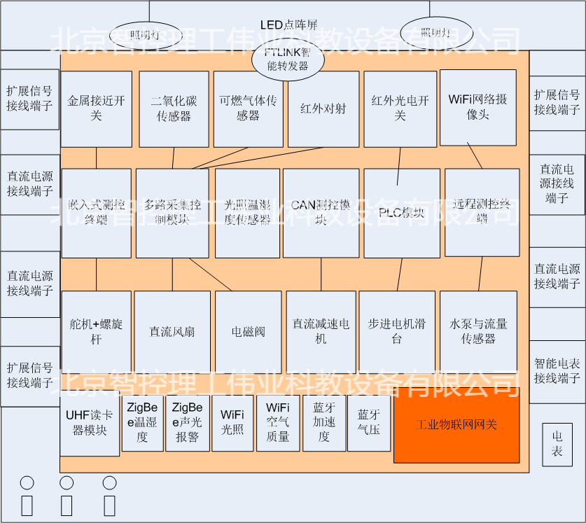 實訓臺主要由工業(yè)物聯(lián)網(wǎng)網(wǎng)關(guān)、無線傳感節(jié)點、工業(yè)傳感器執(zhí)行器件、以及臺體框架(含電源接線端子、傳感器接線端子、通信接口面板等)組成。布局如圖所示。