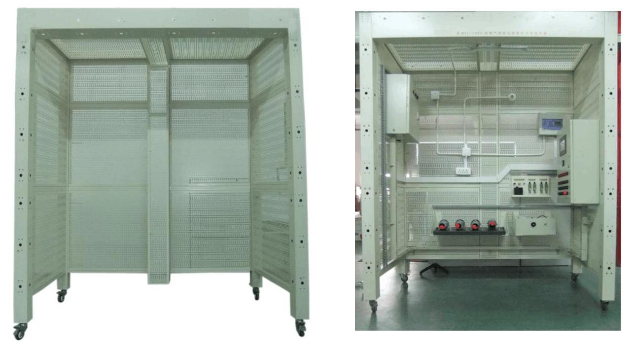 裝置可進行電工安裝,如橋架安裝,PVC管安裝,吊燈,白熾燈座,日光燈,開關,插座,控制箱,配電箱等,包含有交流異步電動機,直流電動機,步進電機,伺服電機,溫度控制器,電偶,PLC,變頻器觸摸屏等控制與受控對象。每個操作組配套一個移動式工具車和元件柜,便于對原件的保管和安裝施工,從根本上解決了學校在普通墻面上進行安裝培訓的使用不方便,實訓范圍窄的問題。