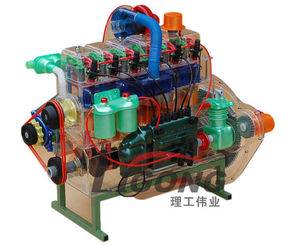透明發(fā)動機(jī)模型外殼選用透明有機(jī)玻璃制作,內(nèi)部部件均以硬質(zhì)塑料料加工,用螺絲固定在金屬高溫烘漆而成的鐵架子上。總成部分都以壓模成形加工,代替過去膠粘合的方法,使產(chǎn)品在強(qiáng)度上有很大提高。發(fā)動機(jī)總成模型用直流電機(jī)驅(qū)動,能演示發(fā)動機(jī)內(nèi)部曲軸、活塞、氣門等運(yùn)行情況,點(diǎn)火系統(tǒng)采用燈光演示,能根據(jù)實(shí)際發(fā)動機(jī)運(yùn)行時的點(diǎn)火順序進(jìn)行演示。