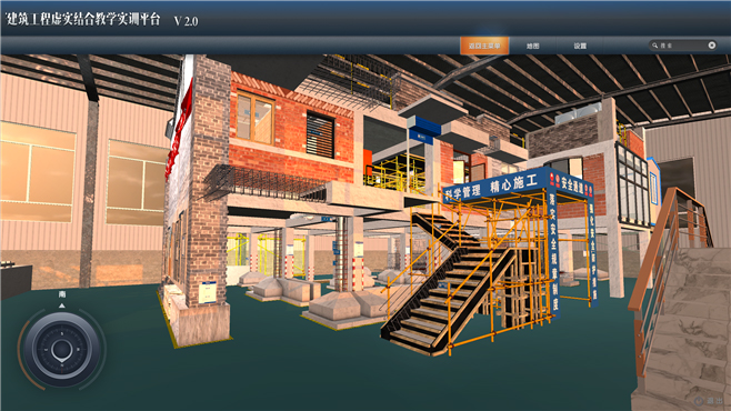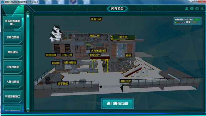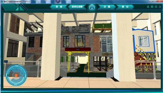 2. 建筑工程虛擬仿真教學軟件系統可通過漫游模式或點擊對應菜單進入仿真程序,并在進入程序后可進行相互切換。