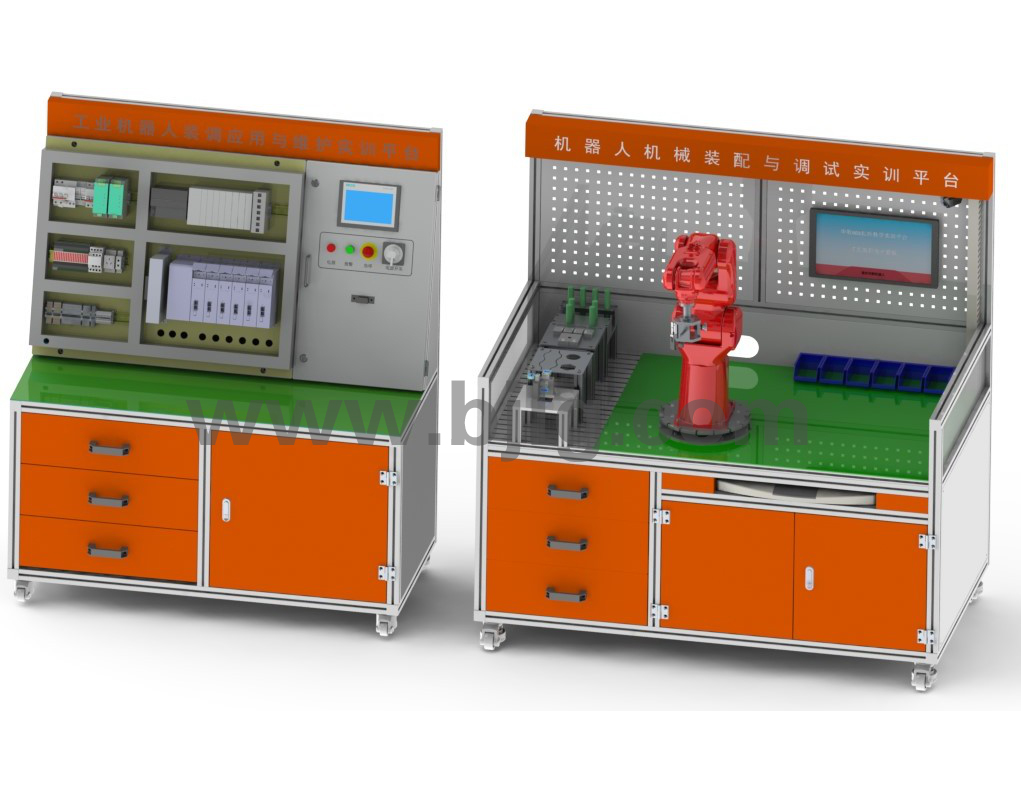 LGH-IRW03型 工業機器人裝調應用與維護實訓平臺設置內容對應工業機器人機械裝配與調試、電氣安裝與調試、機電聯調、機器人功能應用、PLC 應用、故障維修等職業技術技能,涵蓋工業機器人機電裝調、工業機器人位置示教、工業機器人編程、工業機器人與 PLC 的通信、人機交互、可編程控制、氣動控制等專業核心能力和核心知識。同時,工業機器人裝調應用與維護實訓平臺可服務于中職、高職以及應用本科院?!豆I機器人基礎》、《工業機器人拆裝與調試》、《工業機器人示教與編程》、《工業機器人應用與維護》等多門課程教學,引領相關院校機器人及相關專業的課程建設和深化課程教學改革。LGH-IRW03型 工業機器人裝調應用與維護實訓平臺由“機器人機械裝配與調試實訓平臺”和“機器人電氣安裝與調試實訓平臺”兩大部分構成,并配置軌跡描繪、搬運、碼垛等典型應用實訓組件。