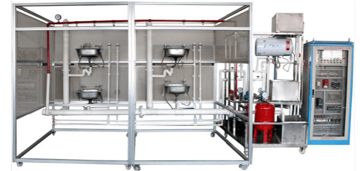 1、不銹鋼水盤,冷、熱兩用水龍頭,模擬兩層建筑、網孔式房間、4個住戶用水終端