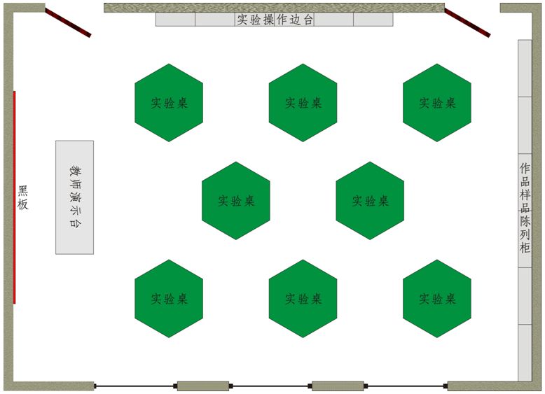 規格:正六邊形,邊長為700mm,高度為760mm。 臺面基材為25mm厚E1級刨花板,墨綠色防火板貼面,臺身采用18mm厚三聚氰胺貼面刨花板(E1級),框架采用鋁合金框架結構,材料為φ50鋁型材,壁厚1.5mm,表面氧化處理。 |