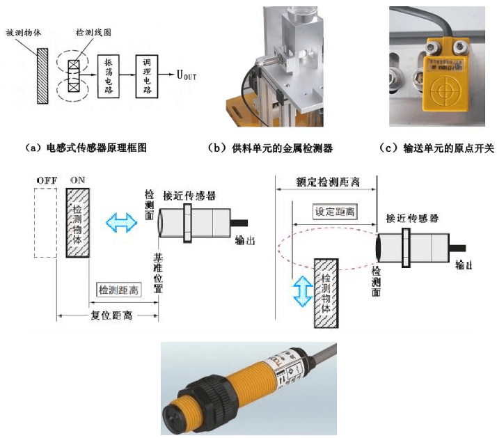 電感式接近開關是利用電渦流效應制造的傳感器。電渦流效應是指當金屬物體處于一個交變的磁場中,在金屬內部會產生交變的電渦流,該渦流又會反作用于產生它的磁場這樣種物理效應。如果這個交變的磁場是由一個電感線圈產生的,則這個電感線圈中的電流就會發生變化,用于平衡渦流產生的磁場。利用這一原理,以高頻振器(LC振蕩器)中的電感線圈作為檢測元件,當被測金屬物體接近電感線圈時產生了渦流效應,引起振蕩器振幅或頻率的變化,由傳感器的信號調理電路(包括檢波、放大、整形、輸出等電路)將該變化轉換成開關量輸出,從而達到檢測目的。電感式接近傳感器工作原理框圖如圖2-14 (a)