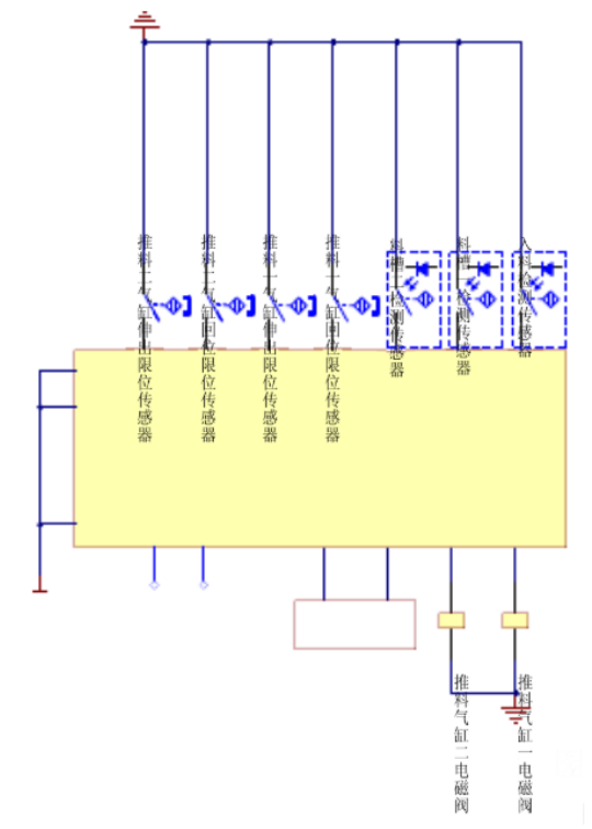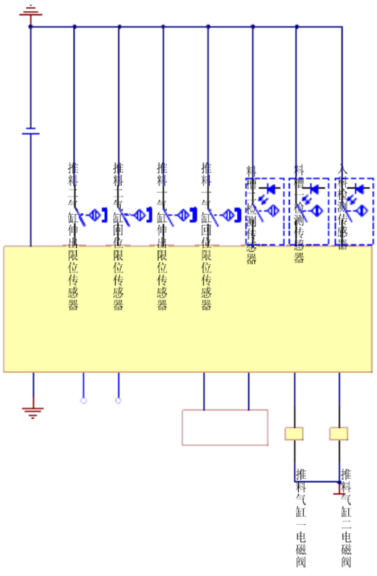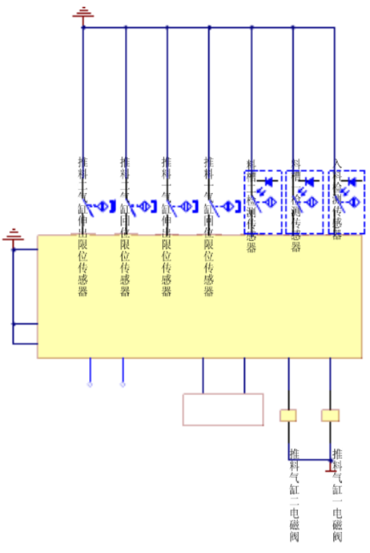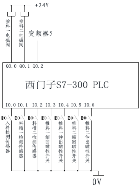 系統啟動,將物料放到光電傳感器前的皮帶上,當光電傳感器檢測到有工件進入,即給控制系統發出信號,控制系統給變頻器發出啟動信號。變頻器驅動三相交流電機帶動皮帶轉動,當物料為金屬時電感傳感器檢測到信號,變頻器停止,推料氣缸一動作,將物料推入第一個料槽;當物料為非金屬時電容傳感器檢測到信號,變頻器停止,推料氣缸二動作,將物料推入第二個料槽。
