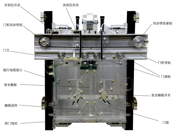 在轎廂門的邊沿上,裝有活動的安全觸板。當門在關閉過程中,安全觸板與乘客或障礙物相接觸時,通過與安全觸板相連的聯(lián)桿,觸及裝在轎廂門上的微動開關動作,使門重新打開,避免事故發(fā)生。