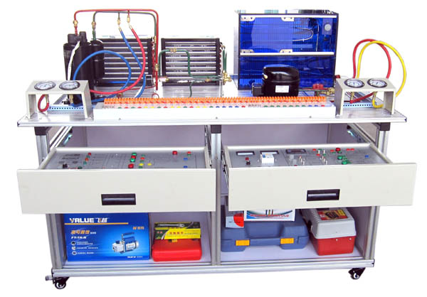 2、導軌式鋁合金安裝平臺由標準規格的鋁合金工業型材組成,作為學生操作訓練的平臺,上面安裝有空調系統部件和冰箱系統部件。