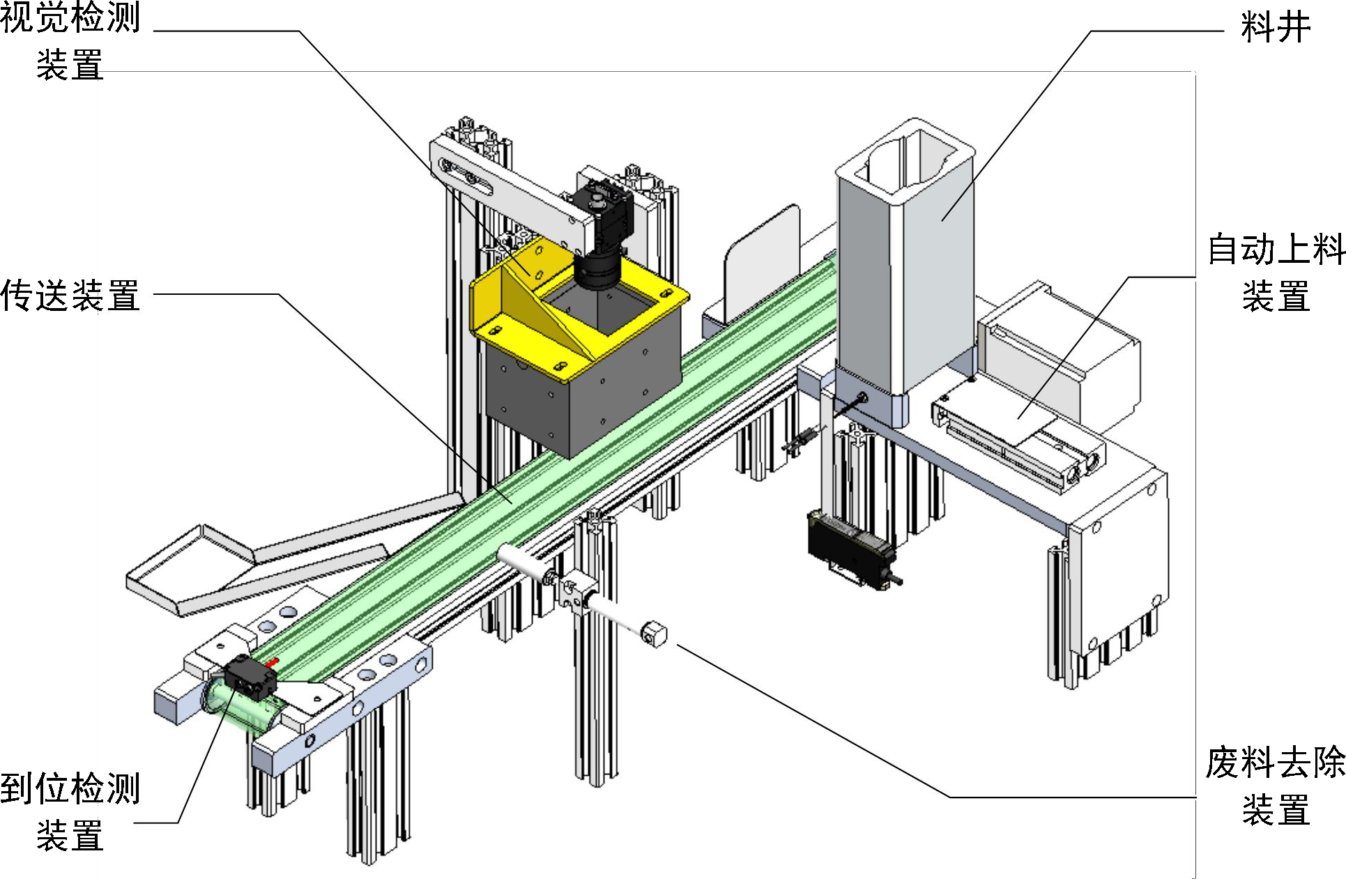 多功能料井為鋁合金材質(zhì),可兼容正方形、長方形和圓形三種形狀的物料塊以固定的姿態(tài)到達料井底部,料井底部設(shè)置有反射型光纖傳感器,當(dāng)傳感器檢測到有物料落下時,觸發(fā)自動上料裝置,雙軸氣缸將物料推送到傳送裝置上。傳送裝置上電機配合精密減速器驅(qū)動傳送帶模擬真實工廠的流水線,在流水線的中間設(shè)置有視覺檢測裝置,檢測合格產(chǎn)品可以到達傳送帶的末端,不合格產(chǎn)品作為廢料,由廢料去除裝置推出傳送帶。在傳送帶末端配有精密傳感器感應(yīng)產(chǎn)品是否到位。