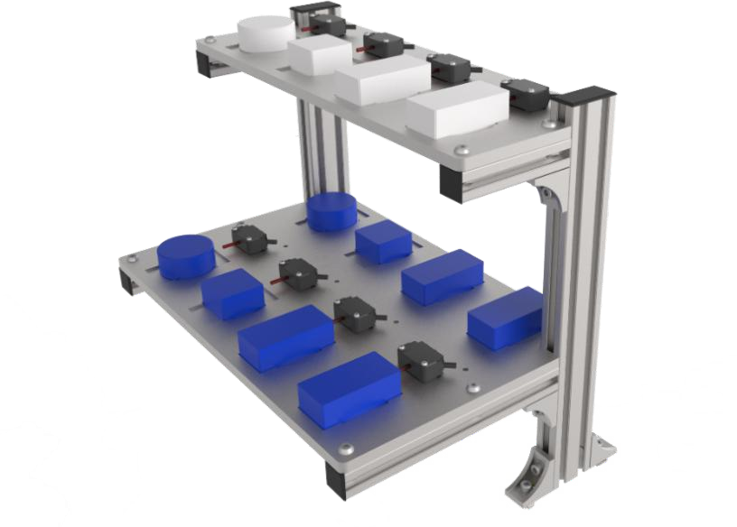 智能料庫分為上下兩層,每層設(shè)置 4 個工位。每個工位都可以放置正方形、長方形或圓形的物料。同時,每個工位安裝有傳感檢測裝置,可自行判斷此工位是否有物料。