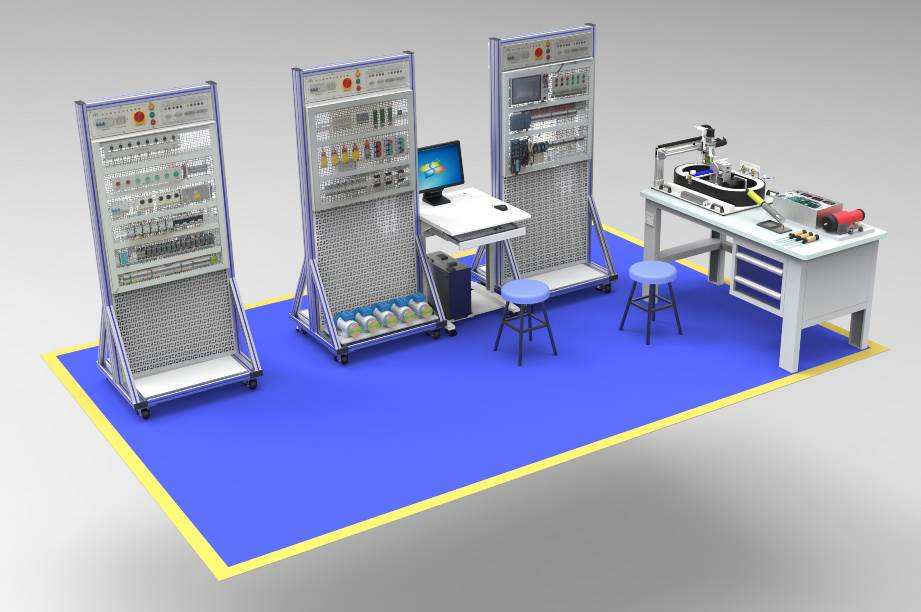 該設(shè)備由PLC電氣控制應(yīng)用平臺、電力拖動安裝平臺、立式塑膠機控制電路故障診斷實訓(xùn)平臺、電腦桌、裝配桌、實訓(xùn)儀表工具等組成。