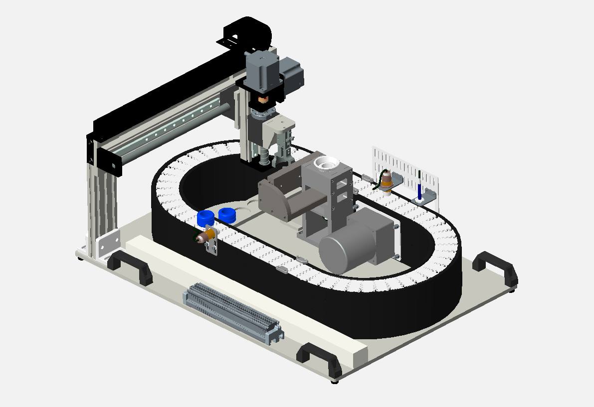 模型底板由8mm厚鋁板加工氧化而成,裝有四個黑色鑄鋁拉手,方便搬運。底板上方有環(huán)形輸送帶、氣動機械手、搬運龍門架、分揀機構(gòu)、變頻電機、伺服電機、步進電機、多種傳感器及氣缸等組成。該任務(wù)模擬生產(chǎn)線自動化控制,變頻器控制輸送帶電機實現(xiàn)調(diào)速功能;通過光纖、光電、金屬、RFID等多種傳感器檢測,PLC控制伺服、步進、多種氣缸動作完成上料、分揀、搬運等多種功能。同時為方便教學(xué),端口采用全開放設(shè)計。