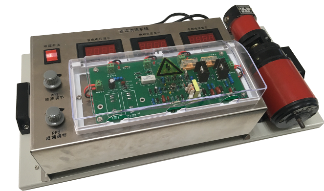 模塊底板采用優(yōu)質(zhì)Q235冷軋鋼板經(jīng)折彎后焊接而成,表面靜電噴塑處理。底板上裝有兩個黑色鑄鋁拉手,方便搬運。底板上方有直流電機、測速發(fā)電機、直流調(diào)速線路板、顯示系統(tǒng)等組成。該模塊采用測速發(fā)電機反饋電壓和給定電壓形成閉環(huán)調(diào)速系統(tǒng),調(diào)速系統(tǒng)由給定電壓、轉(zhuǎn)速負反饋、放大電路、觸發(fā)產(chǎn)生電路及主電路組成。學(xué)員根據(jù)功能要求進行測量分析,完成故障診斷與排除。