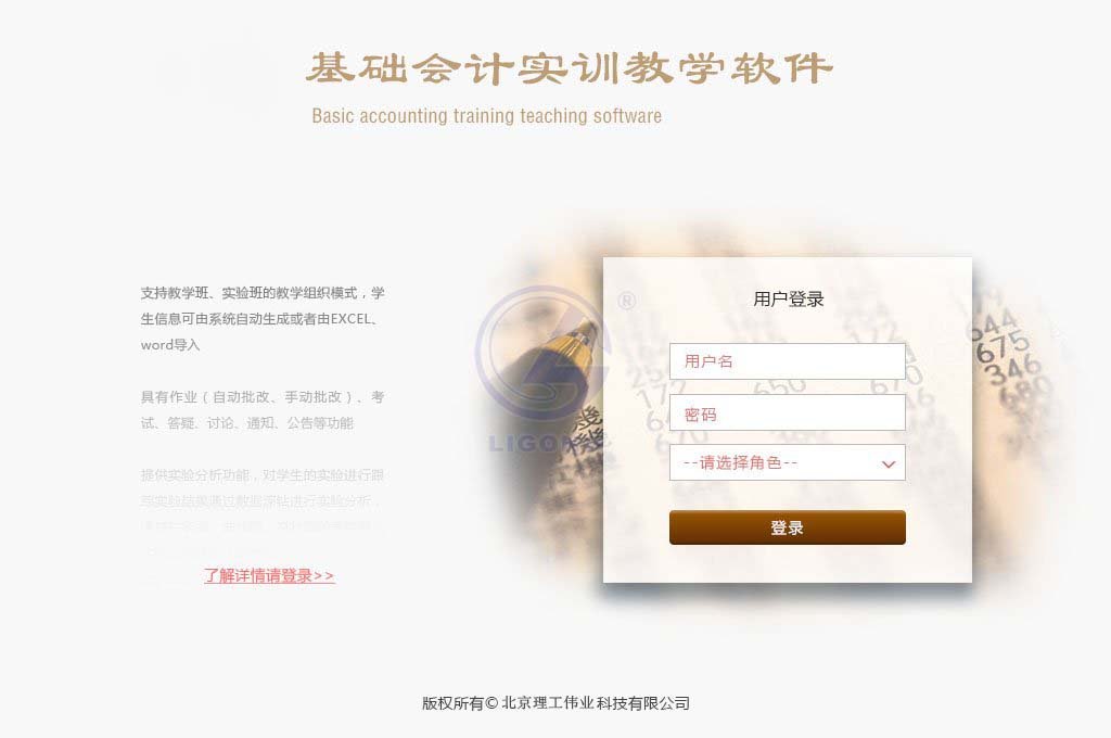 一、核心參數: 1.軟件按會計教學課程章節預置實訓內容,既有單項實訓又有綜合實訓,可按章節形式進行教學,教師可自行調整章節順序。 2.B/S結構,無用戶數限制,客...基礎會計模擬實訓軟件