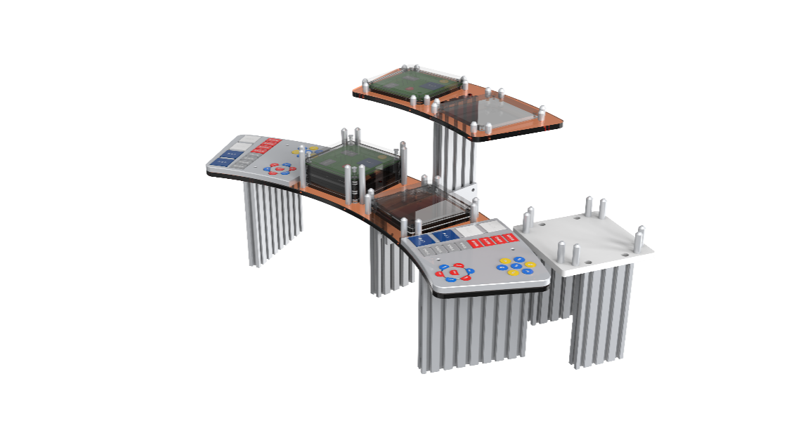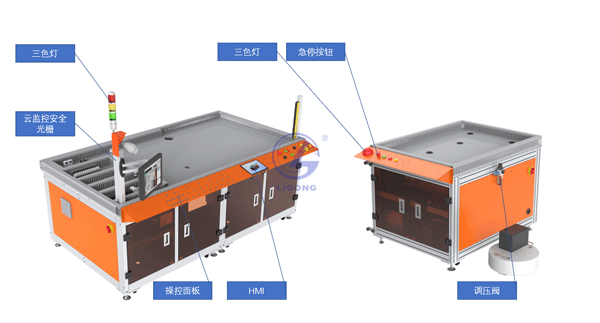 設備架體用于支持各單元,上臺面為型材臺面,各單元可方便在臺面安裝。具有腳輪,可用于移動設備。上面安裝有云監控安全光柵、三色燈,另一臺架控制面板上也具有三色燈,用于顯示協作機器人運行狀態。控制面板安裝有急停開關,可在緊急情況下快速停止設備。架體前方可開門,可放置工具、行星裝配模塊、2D軌跡訓練單元、3D軌跡訓練單元等物品。如圖所示。