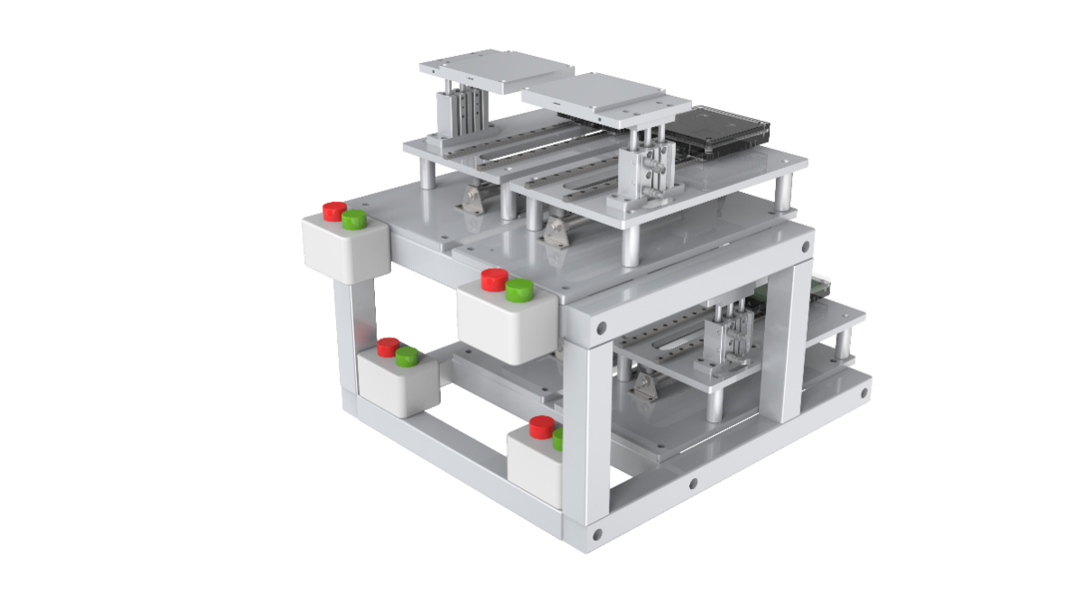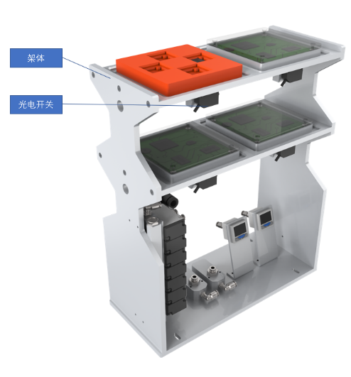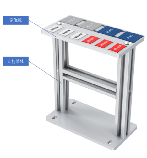 緩存單元是機器人將分揀后的芯片放入定位板內;可以根據需求設定,讓機器人取揀選不同的芯片放至對應的槽位。由支撐架體、定位板等組成。如圖所示。