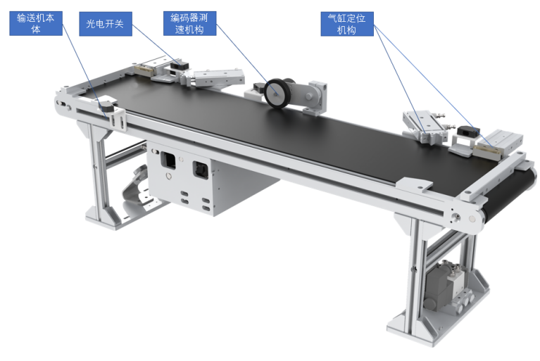 皮帶輸送單元是設備的重要組成部分,負責接駁CPU托盤的運輸,包括輸送機本體、氣缸定位機構、編碼器測速機構、光電開關等組件構成,如圖所示。芯片托盤在兩端位置可以用氣缸定位機構定位,方便機器人精準上料,編碼器可以實時測得皮帶線速度,以結合機器人和視覺相機進行動態抓取及物料識別。側面具有光電開關,可檢測芯片托盤位置。如圖所示