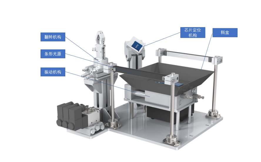 芯片供料單元由料盒、翻轉機構、芯片定位機構、條形光源等組成。芯片可以在翻轉機構上進行正反方向改變,料盒振動功能,由氣缸伸縮實現??蓪崿F芯片的重新排列。料盒兩側具有條形光源,可補償外部環境對于視覺的干擾。芯片定位機構是利用芯片的自重可進行二次定位,以便于協作機器人精準取放。如圖所示