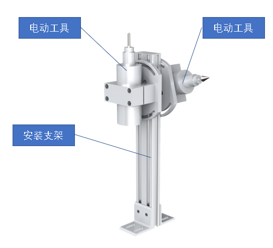 加工單元由安裝架體、銑刀電動工具、打磨電動工具等組成,可對零件表面進行銑削以及打磨,并且兩個工具都可以調整角度,方便與機器人進行角度配合。非常詳細的展示實際生產中這兩種不同的加工工藝,極大的加深了學生對兩種工藝理解和認知。如圖所示。