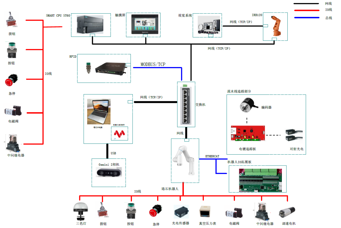 智能制造設備技術應用平臺取于工業應用場景,里面主要元件如工業機器人、協作機器人、鎖螺絲工具、皮帶輸送單元等均來自實際應用場景。