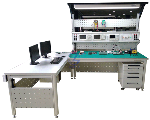 1.工作臺:桌身采用優(yōu)質(zhì)鋁型材做骨架,整機既堅固耐用,美觀大方。桌面采用25mm厚高密度纖維板,外貼防火板,PVC截面封邊,具有耐磨、耐熱、耐污、耐火、耐菌、防霉、抗靜電及易清潔等特點。工作臺設有防靜電配套裝置,桌面上方有實訓屏、模塊盒安放橫梁、工具網(wǎng)孔板、高檔條形LED照明。