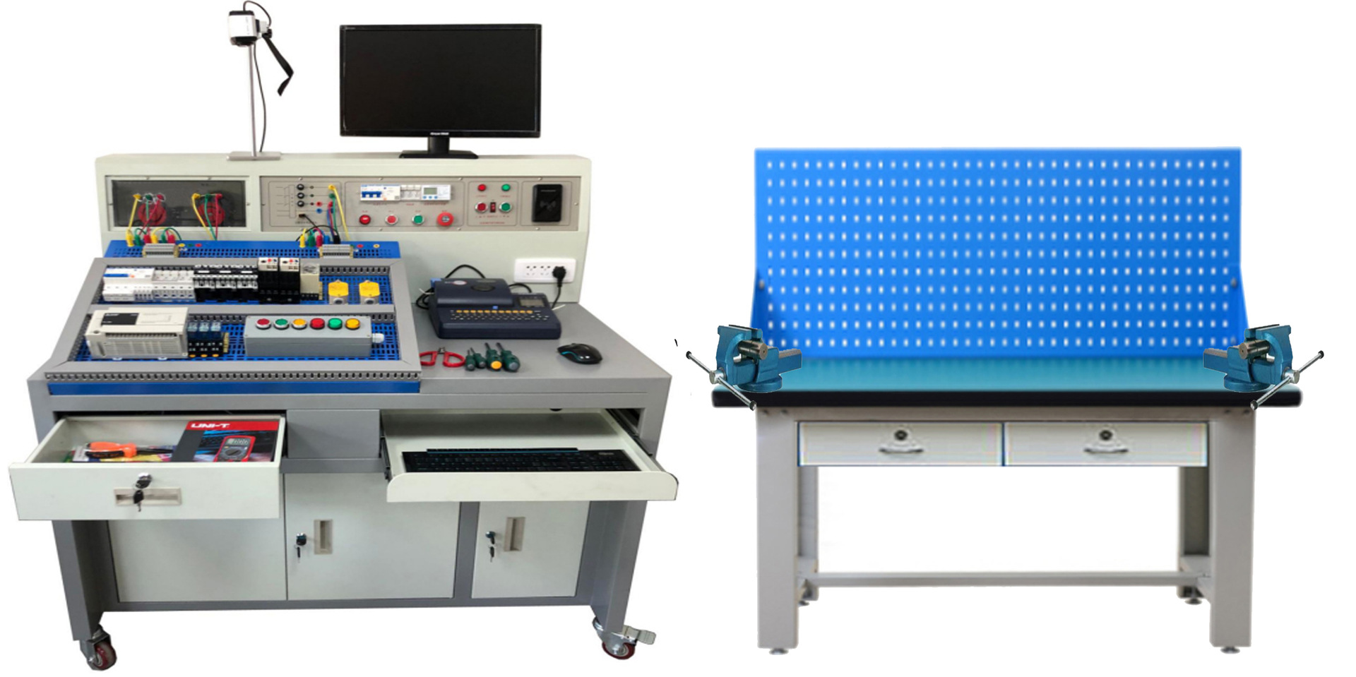 (1)本設(shè)備由實(shí)訓(xùn)屏(內(nèi)置電源)、實(shí)訓(xùn)桌、儲物柜三大部分組成。以30mm×30mm成型方鋼作為設(shè)備主要框架材料;實(shí)訓(xùn)屏、地盤采用焊接連接、關(guān)鍵部位采用三角筋用內(nèi)六角螺釘加固連接,表面經(jīng)高溫噴塑處理,美觀大方且有效起到防銹絕緣的作用;由兩條35mm×35mm鋁合金型材及滑槽組成網(wǎng)孔板固定機(jī)構(gòu);固定機(jī)構(gòu)的下方是鐵制雙工位電源箱,每工位電源箱的布局依次為電源保護(hù)裝置、電源指示裝置、電源輸出;實(shí)訓(xùn)桌桌面采用雙層亞光密紋結(jié)構(gòu),表面經(jīng)過噴塑處理,提高防銹、絕緣性能;實(shí)驗(yàn)桌底部裝有至少4個導(dǎo)向輪,方便設(shè)備移動。