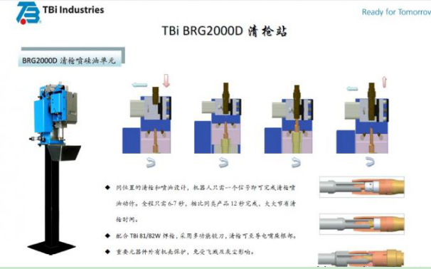 (1)德國TBi BRG-2000D清槍剪絲機構同位置的清槍和噴油設計,機器人只需要一個信號就可以完成清槍噴油動作。