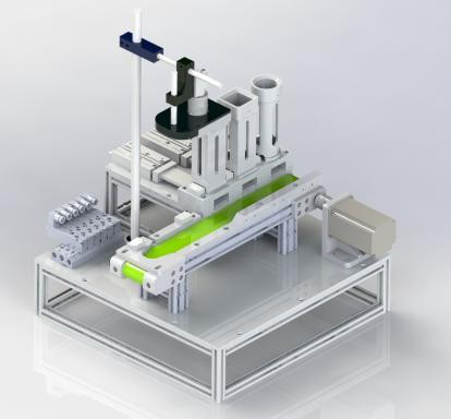 2、自動上料模塊:該模塊由料倉、氣缸、傳送帶、視覺、定位臺組成。自動上料機可以上三種形狀(圓形、方形、矩形)的物料,每種物料又分兩種顏色(藍色、紅色),選手通過視覺系統(tǒng)識別物料形狀與顏色來分類物料。