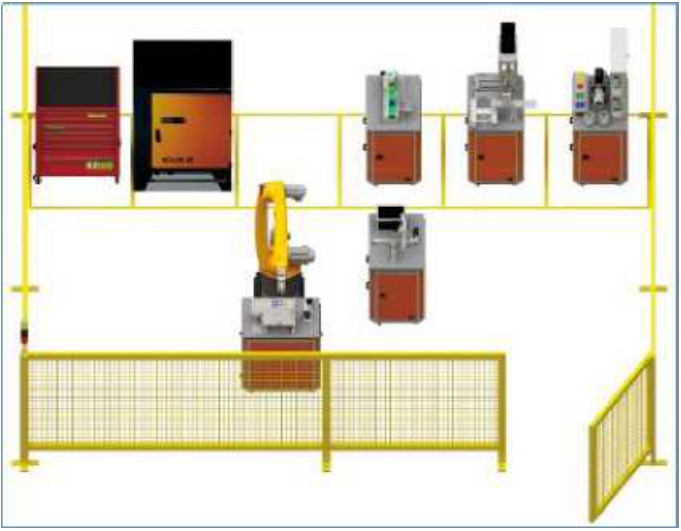 工業機器人組合移動式實訓裝置由工業機器人、基礎技能實訓模塊M、拓展技能實訓模塊Ml、拓展技能實訓模塊M2、拓展技能實訓模塊 M3、拓展技能實訓模塊M4、工具柜、電氣控制系統、安全防護系統等(模塊實際組件依據教學側重點可調整或定制)組成。