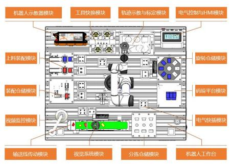 工作臺整體由兩個基礎臺拼接而成,更具空間靈活,拆卸方便等特點。臺面采用標準鋁型材,機器人 及功能模塊可根據需求改變布局位置,所有功能模塊采用手擰螺栓方式固定,可實現無工具快速拆裝與更 換。每個模塊電氣部分配置了獨立的電氣接線盒和快速航插,可實現模塊整體機械和電氣快速安裝部署, 還可根據需求更換或添加功能模塊進行功能擴展。