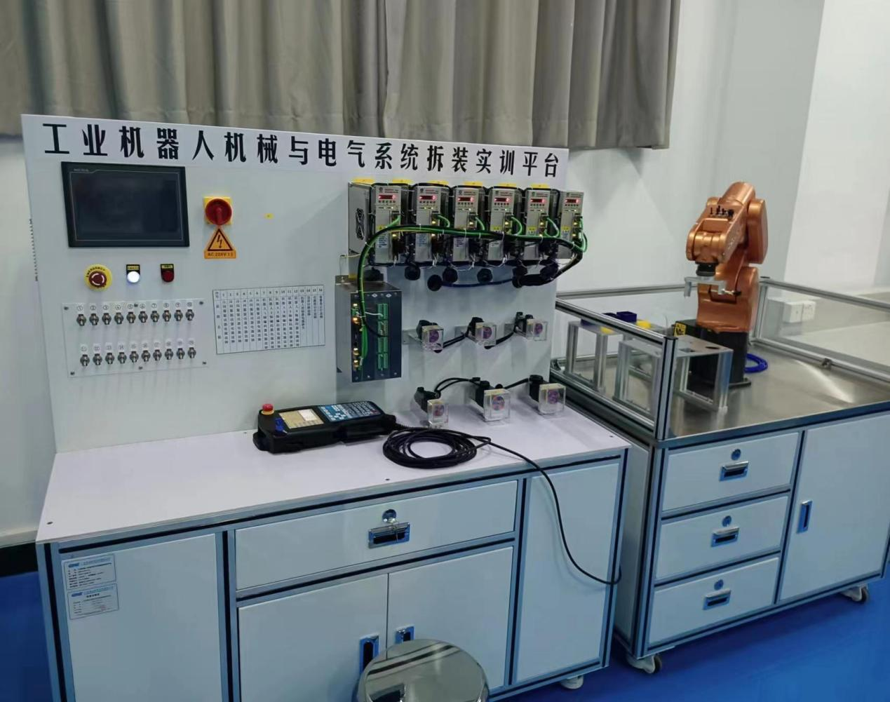 實驗設備可反復實訓使用,將機器人的電氣控制柜進行整體拆除做成一個獨立的工業機器人電氣拆裝系統模塊。具體做法為鋁型材搭建,兩側和底部鈑金封板,為伺服電機、示教器、功能模塊等部件的安裝提供標準的安裝接口,預留有標準電氣接口安裝位置,可根據模塊的使用情況進行功能的擴展,同時為各功能模塊提供穩定的電源。
