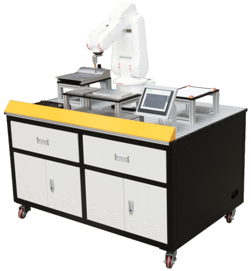 隨著現(xiàn)代制造業(yè)和服務(wù)業(yè)的轉(zhuǎn)型升級(jí),工業(yè)機(jī)器人在測(cè)量檢驗(yàn)、包裝、分揀處理、搬運(yùn)、碼垛、填裝、機(jī)器上下料、裝配、金屬切割、焊接、噴涂等領(lǐng)域得到了越來(lái)越多的應(yīng)用。在不同領(lǐng)域的應(yīng)用會(huì)對(duì)機(jī)器人的安裝、編程、調(diào)試人員提出了不同的要求。根據(jù)這一工作的需要設(shè)計(jì)了LGY-JC02B型工業(yè)機(jī)器人基礎(chǔ)實(shí)訓(xùn)設(shè)備。該設(shè)備是由一臺(tái)六軸工業(yè)機(jī)器人、書(shū)寫(xiě)工作站、曲面軌跡工作站、碼垛工作站、實(shí)訓(xùn)桌、電氣控制部分組成。設(shè)備全部采用工業(yè)標(biāo)準(zhǔn)電氣設(shè)備進(jìn)行安裝生產(chǎn)且為當(dāng)今自動(dòng)化主流設(shè)備,該設(shè)備能完成由現(xiàn)實(shí)工業(yè)生產(chǎn)轉(zhuǎn)變?yōu)榭晒W(xué)生學(xué)習(xí)的高仿真度的現(xiàn)場(chǎng)工作環(huán)境,培養(yǎng)學(xué)生的認(rèn)知能力及學(xué)習(xí)能力,使學(xué)生一進(jìn)入該領(lǐng)域即可快速適應(yīng)現(xiàn)實(shí)中的生產(chǎn)物流環(huán)節(jié),提高學(xué)生的競(jìng)爭(zhēng)力。