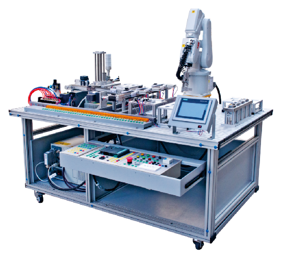 該平臺(tái)各組件均安裝在型材桌面上,機(jī)械結(jié)構(gòu)、電氣控制回路、執(zhí)行機(jī)構(gòu)相對(duì)獨(dú)立,采用工業(yè)標(biāo)準(zhǔn)件設(shè)計(jì)。通過(guò)此平臺(tái)可以進(jìn)行機(jī)械組裝、電氣線路設(shè)計(jì)與接線、PLC編程與調(diào)試、工業(yè)機(jī)器人編程與調(diào)試等方面訓(xùn)練。