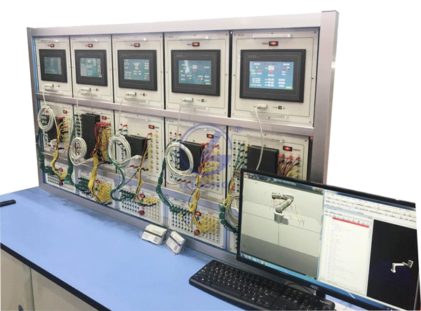 (4)配置與真實產線一致的PLC、人機界面,各6個站;西門子1200系列PLC6臺;昆侖通態TCP7032KT觸摸屏6臺;機器人示教器1套所有端口引出至面板的安全插座上,方便實驗連線。每個模塊安裝在掛箱上。