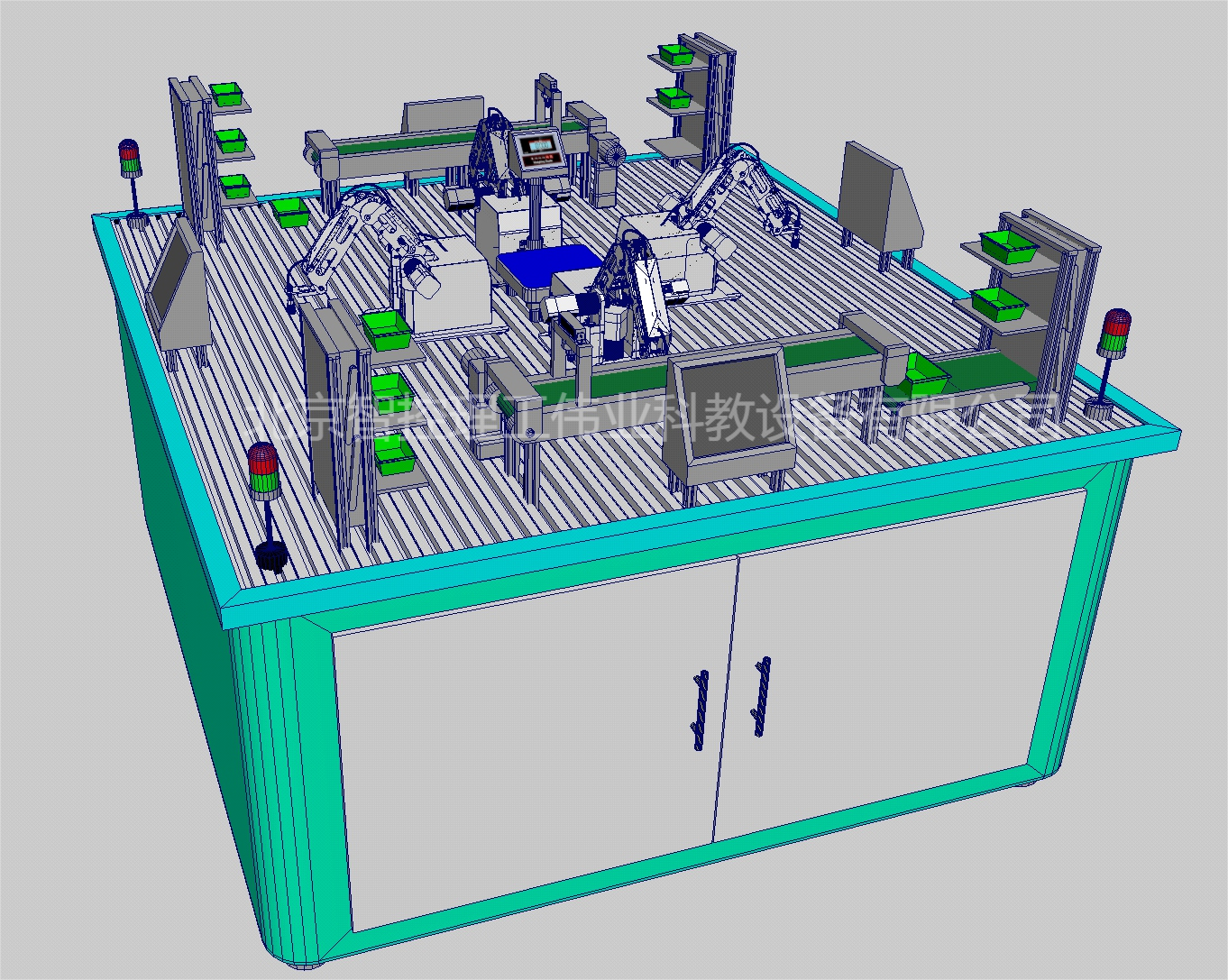 系統(tǒng)各模塊放置于鋁型材實(shí)訓(xùn)臺(tái)上,實(shí)訓(xùn)臺(tái)主架由鈑金與鋁型材搭建,兩側(cè)安裝擋板,采用半封閉式結(jié)構(gòu)加強(qiáng)空氣流通以便散熱,邊角圓弧處理。前部亞克力材質(zhì)對開門,安全操作方便,外形規(guī)整大方。實(shí)訓(xùn)臺(tái)底部配置剎車滾輪和可調(diào)支腳,方便支撐與移動(dòng)。系統(tǒng)抽展式控制部分水平配滑道放置在實(shí)訓(xùn)臺(tái)中央,對門打開時(shí),控制部分可拉出。底部形態(tài):可調(diào)支腳與滾輪。