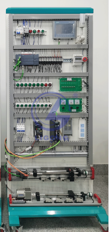 4、電氣控制實訓板上主要硬件有:空氣開關、變頻器、伺服驅動器、電源保護及操作按鈕和指示燈、PLC、觸摸屏、24VDC 50W開關電源、模擬量輸出驅動調壓模塊等控制器件。