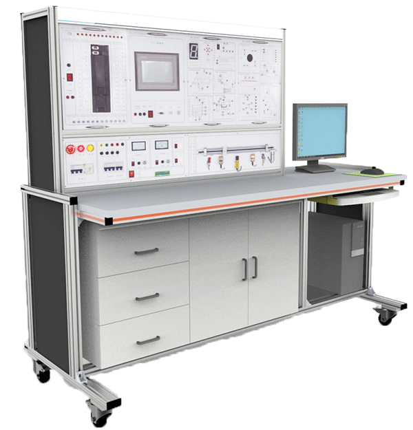 2、臺架構成:實訓臺采用工業鋁型材加工。桌面下面放置儲物柜,左側有3層抽屜,用于存放工具以及實訓資料,右側為雙拉門式設計,可以放置實訓掛箱。底部裝有四個帶鎖止功能的萬向輪。柜體后下側留有電源輸入線。預留計算機放置位置。