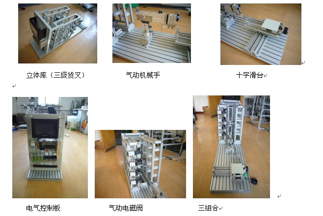 LGZH-02 柔性三組合機電一體化創(chuàng)新模型實現(xiàn)動作為:首先立體庫堆垛機具有水平垂直運動,由步進電機拖動,帶動貨叉,進行貨物存取,貨叉為三級機械傳動。氣動機械手可實現(xiàn)手爪抓取,提升,轉(zhuǎn)半圈,放下,松開手爪。十字滑臺可走出四角上一周的四個位置,上方裝有筆架,可以繪圖寫字,上方還裝有接近開關和顏色開關及支架,可對滑臺上的物體進行識別。