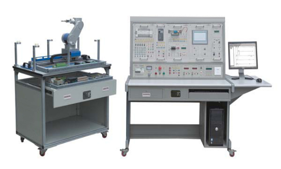 實訓裝置由控制屏、實訓桌、PLC 模塊、通信模塊、變頻器模塊、模擬實訓模塊、觸摸屏模塊、五自由度機械手、交流電機、電機導軌、測速機構、加載系統、MCGS 工控組態軟件(配加密狗)等組成。