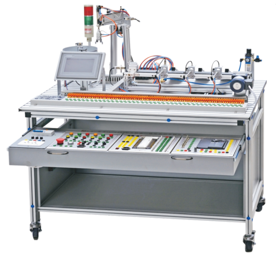 本設備主要包括實訓臺架、典型的機電一體化設備的機械部件、PLC模塊、變頻器模塊、按鈕模塊、電源模塊、模擬生產設備實訓模塊、接線端子排和各種傳感器等組成。整體結構采用開放式和拆裝式,實訓裝置用于機械部件組裝,可根據現有的機械部件組裝生產設備,也可添加機械部件組裝其他生產設備,使整個裝置能夠靈活的按教學或競賽要求組裝具有生產功能的機電一體化設備。
