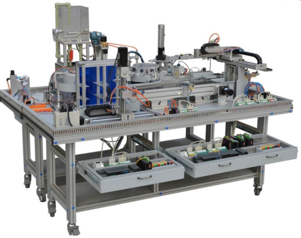 系統(tǒng)由鍵盤抽屜、電腦桌、主桌體、觸摸屏模塊、、掛箱抽屜、包裝蓋章單元、桌面接口線路板、立體倉(cāng)庫(kù)單元、執(zhí)行機(jī)構(gòu)線路板、氣源三聯(lián)件、轉(zhuǎn)盤上料單元、加熱與檢測(cè)單元、1#輸送帶模塊、灌裝加蓋單元、2#輸送帶模塊、3#輸送帶單元、機(jī)器人搬運(yùn)單元等組成。