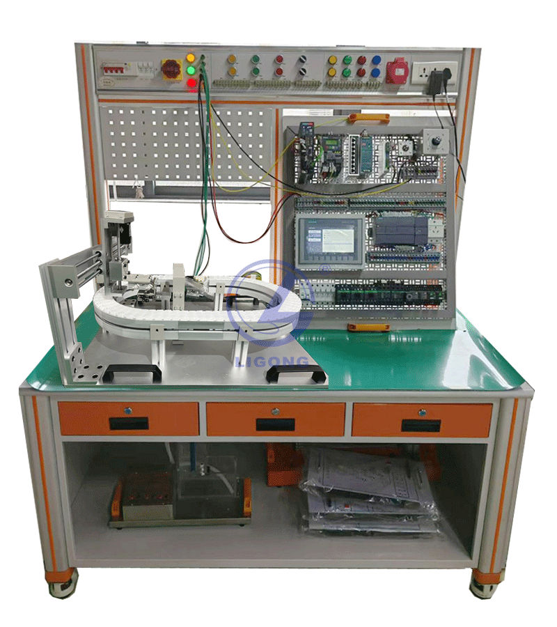 LG-JD02A型 機電一體化實訓工作站采用“模塊化”的設計理念,標準化電路接口、氣路接口和機械接口。總體由工作臺、電氣控制掛板、環形輸送分揀應用模塊等構成。 工作站包含實訓平臺、控制掛板、應用模塊、電腦桌組成,實訓平臺采用優質鋁型材做骨架,鋁型材立柱與實訓桌面連接。左右兩側及后面封裝優質鋼板,正面設計儲物柜與抽屜。