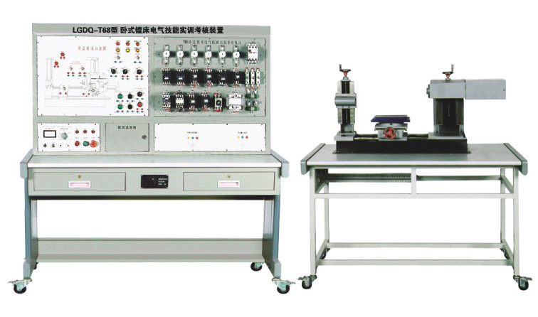 LGDQ-T68 臥式鏜床電氣技能實訓考核裝置(半實物)由電源控制部分、機床電氣控制部分、半仿真機床實物部分構成。電源控制部分包括實訓定時、定時報警、安全用電自動控制等,機床電氣控制部分把整臺機床內部電器裝在正面面板上,能直觀地觀察機床工作時各電器的動作狀況。故障點在面板上設有相應測試點,供實訓考核者測試用。仿真機床部分能模擬機床各種運動。通過臥式鏜床電氣技能實訓考核裝置的實訓能使學員掌握機床常見故障的現象、故障產生的大概部位,熟練掌握機床電路工作原理,其是維修電工初、中、高級技能鑒定的理想實訓設備。