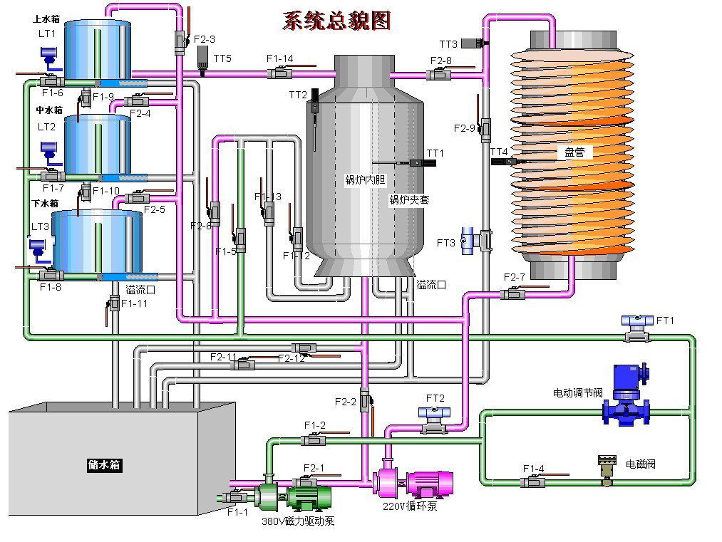 實驗對象系統包含有:不銹鋼儲水箱;上、中、下三個串接有機玻璃圓筒型水箱;三相4.5kW電加熱鍋爐(由不銹鋼鍋爐內膽加溫筒和封閉式外循環不銹鋼冷卻鍋爐夾套構成)和鋁塑盤管組成。